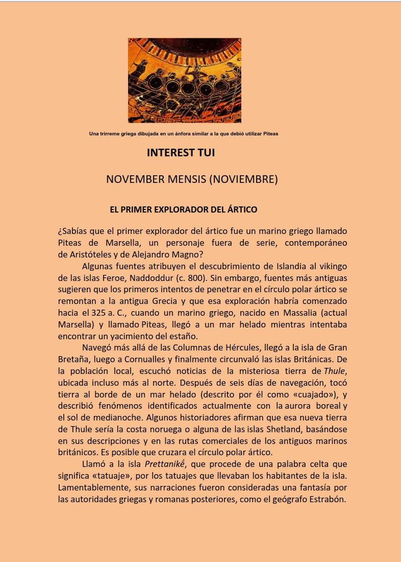 Desde el Dpto de Clásicas y con el objetivo de divulgar la cultura grecolatina, se ha ideado la actividad INTEREST TUI (Te interesa). Esta consiste en la exhibición, en los tablones de entrada del IES, de un cartel que será cambiado cada mes con ese mismo título, destinado a exponer aspectos no demasiado conocidos de la antigüedad clásica, centrados en personajes históricos interesantes, costumbres y sucesos que sorprenderán a más de uno, y que se cruzarán con nosotros, dia tras día, en el hall de entrada, invitándonos a tomarnos un momento para la lectura,el descubrimiento y la reflexión. Pulsa sobre las imágenes para descargar la información.