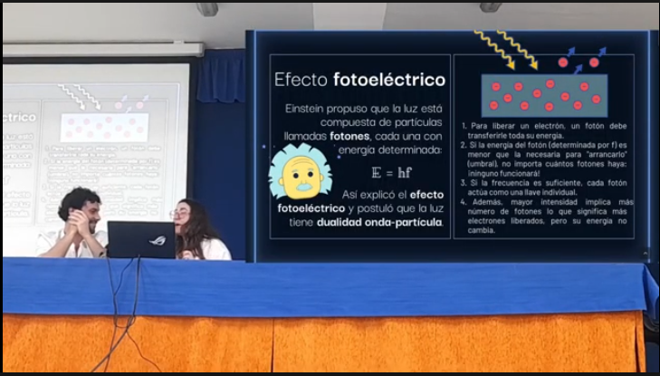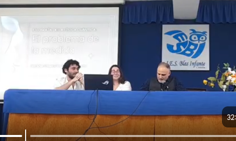 Para clausurar la Expociencia de este año, el graduado en Filosofía por la Universidad de Granada y antiguo alumno de este centro, Javier Arias Trejo, y Ana Rodríguez Artacho, graduada en Física y terminando también sus estudios del grado de Filosofía, han impartido al alumnado de Bachillerato la conferencia "Filosofía de la Física Cuántica: El problema de la medida". De una forma amena y divulgativa han conseguido explicarnos algo de la teoría cuántica y también darnos una visión filosófica de cómo las distintas teorías nos ayudan a explicar el mundo que nos rodea.