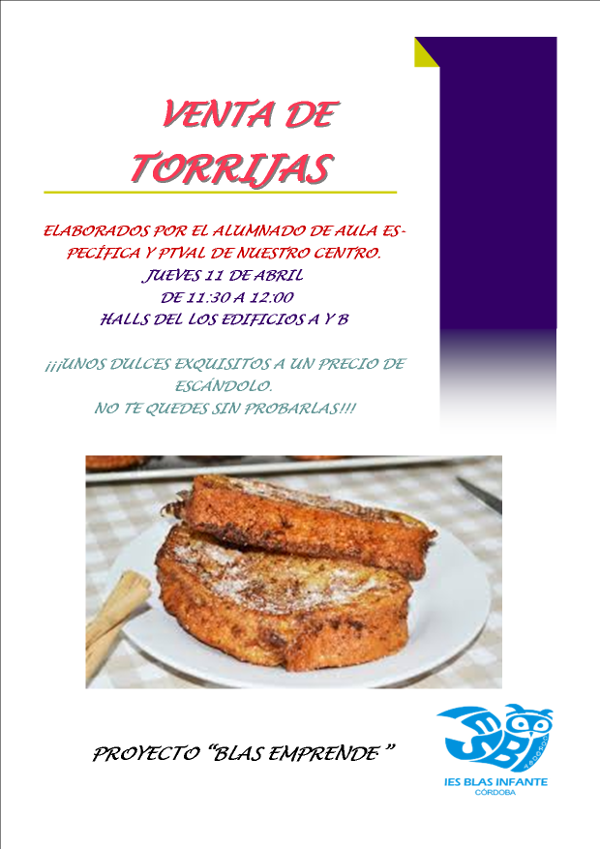 El próximo Jueves día 11 como antesala a las vacaciones, los alumnos de las aulas específica y PTVAL, integrantes del "Blas Emprende", realizarán la venta de TORRIJAS que previamente estarán elaborando esta semana con mucha ilusión.