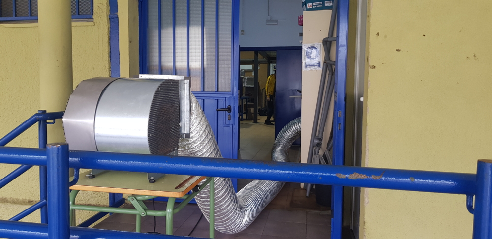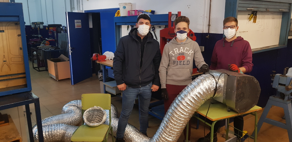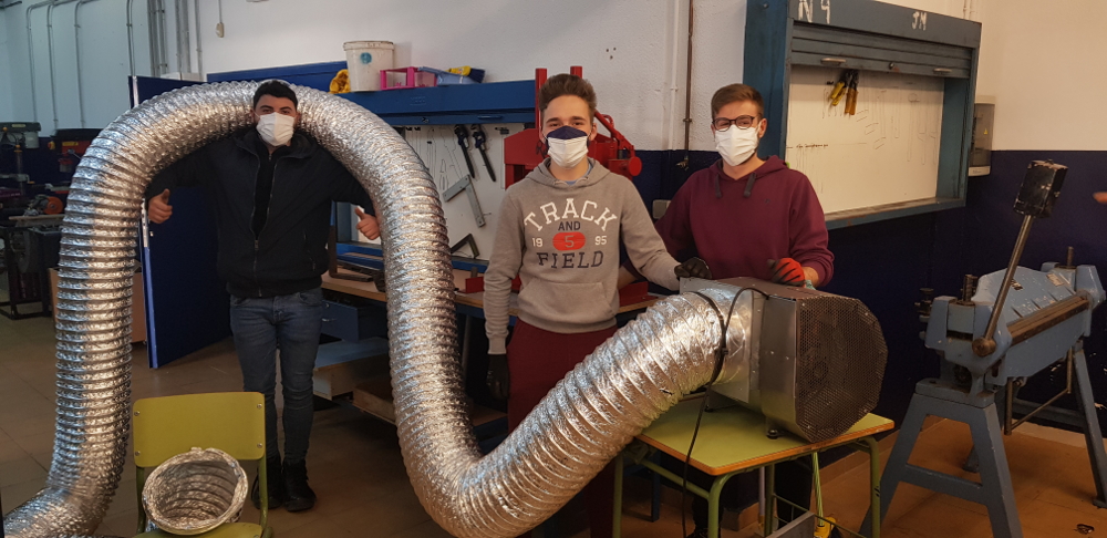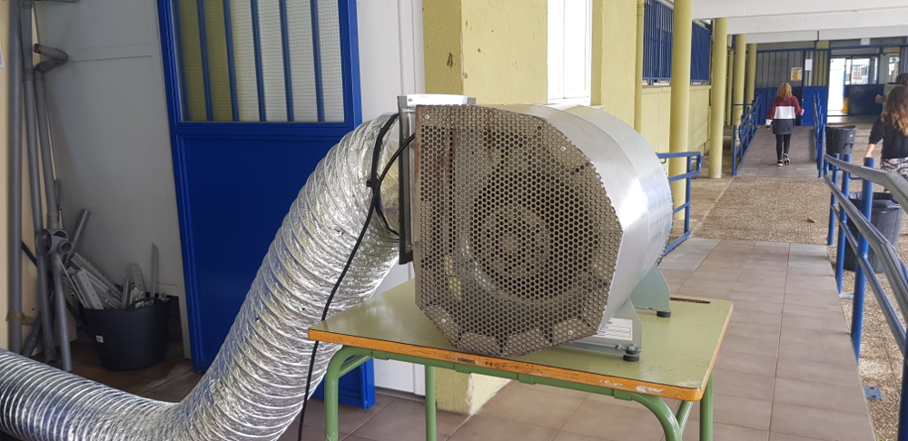 Ante las evidencias sobre las ventajas de la ventilación para prevenir la el contagio del COVID-19, tres alumnos del ciclo de Grado Medio de Técnico de Instalaciones Frigoríficas y de Climatización han adaptado una turbina que se encontraba en el almacén para insuflar aire fresco al taller y mejorar así la ventilación del mismo.