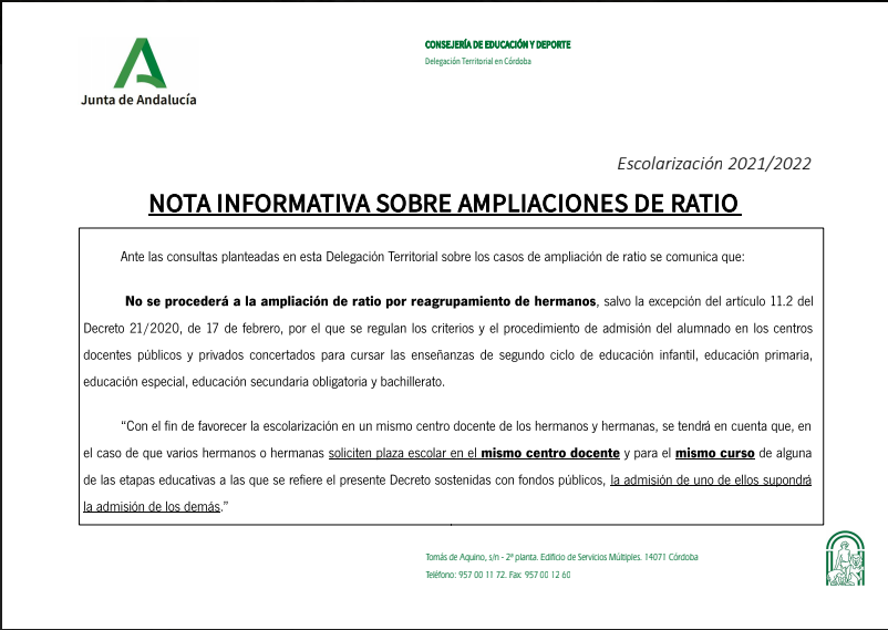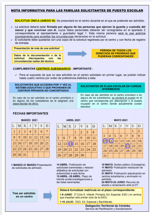 Toda la información relativa al proceso de admisión puede consultarla en la web de la consejería de Educación https://www.juntadeandalucia.es/temas/estudiar/primaria-eso/matriculacion.html