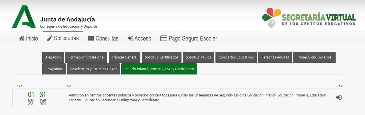 · El alumnado no perteneciente a centros adscritos realizará el proceso de admisión a través de secretaria virtual de los centros docentes andaluces, haciendo click en el apartado solicitudes (2º Ciclo de infantil, Primaria, ESO y Bachillerato). Se accede desde el siguiente enlace: https://www.juntadeandalucia.es/educacion/secretariavirtual/solicitudes/ (Pinchar sobre la imagen)