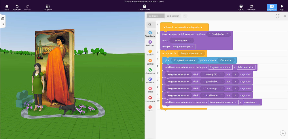 En cada escena se ha programado la interacción con un personaje que muestra la información del cuadro. Para este trabajo se ha utilizado un lenguaje de programación visual pro bloques incluido en la herramienta educativa, pudiendo así trabajar destrezas asociadas al pensamiento computacional