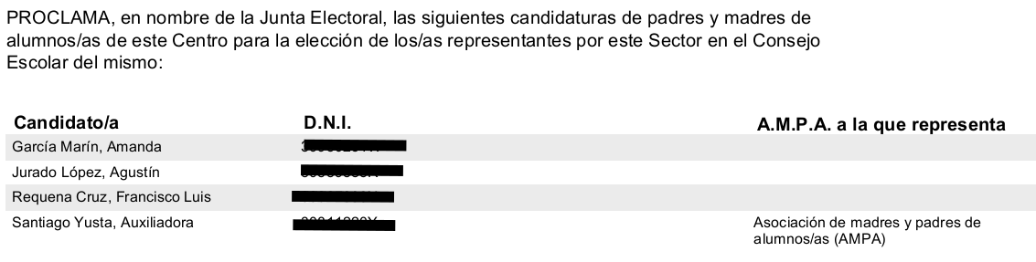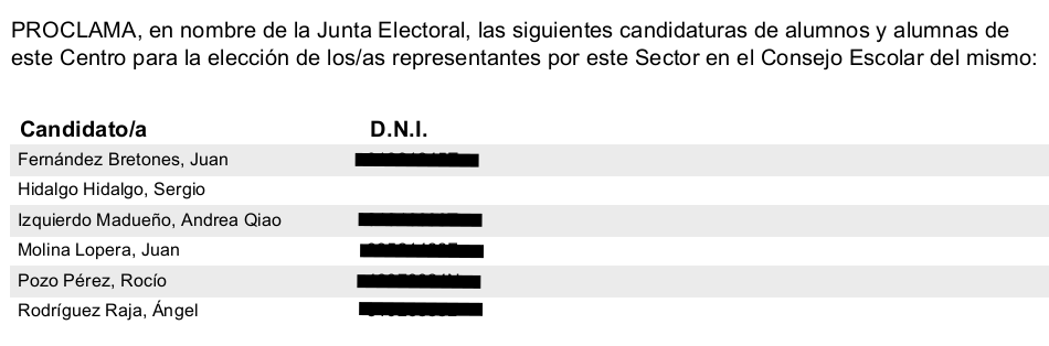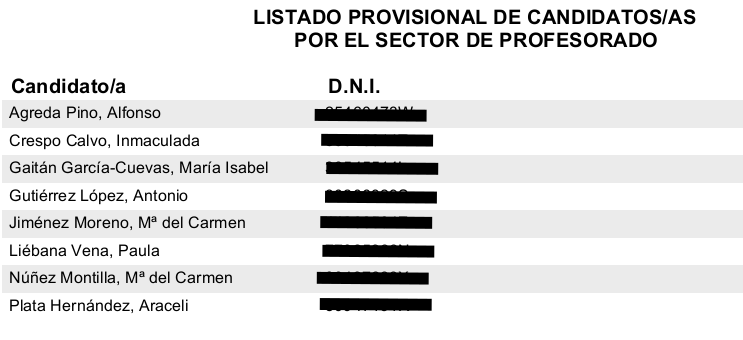 Se publica a continuación el listado provisional de candidatos y candidatas por el sector de alumnado, profesorado y madres/padres/tutores