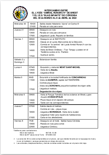 La segunda parte comenzará el 30 de marzo cuando partimos hacia Brest donde estaremos hasta el 7 de abril, llegando a Córdoba el día 8.