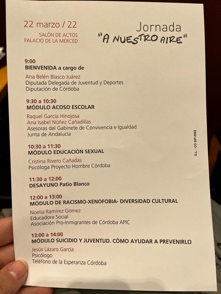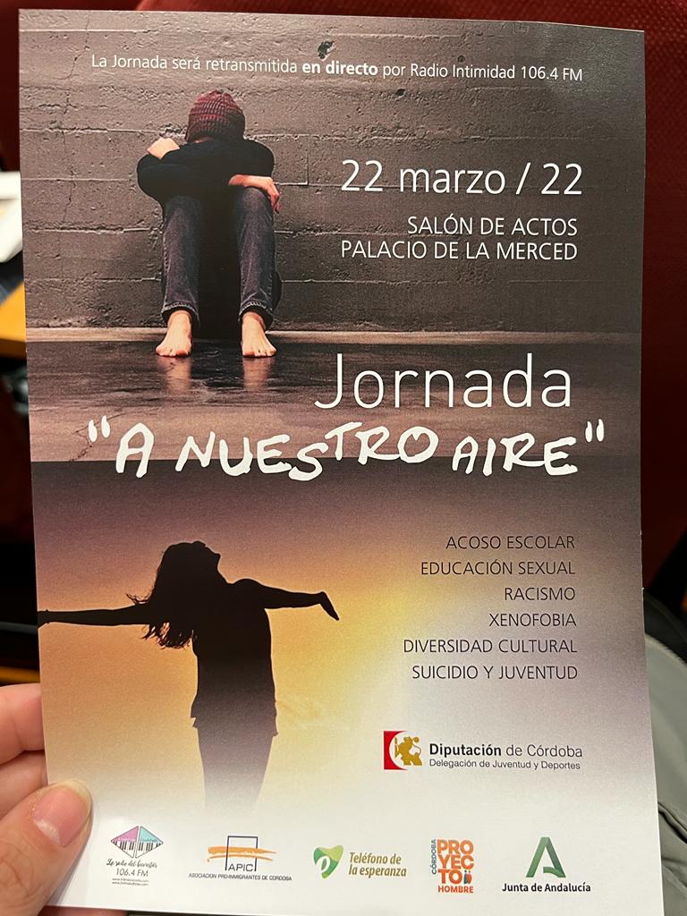 El pasado martes 22 de marzo, alumnado y profesores del centro acudieron a las Jorrnadas "A nuestro aire" organizadas por la Diputación de Córdoba en el Salón de Actos del Palacio de la Merced. La Jornada tuvo como intención visibilizar problemáticas tan actuales como el acoso escolar, la diversidad cultural o el suicidio en la juventud, hecho que se ha visto incrementado tras la pandemia y que, en ocasiones, se intenta minimizar u ocultar entre los adolescentes.