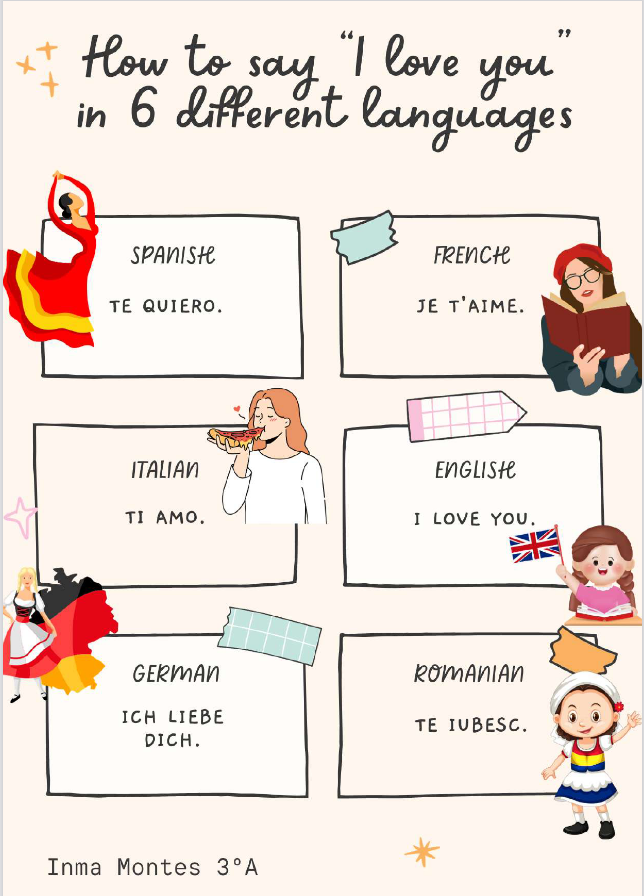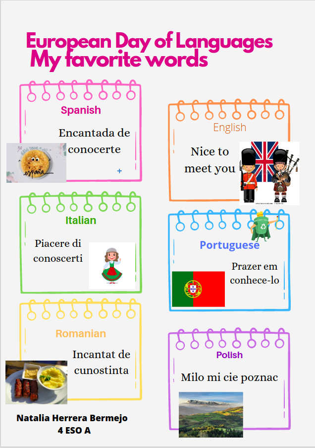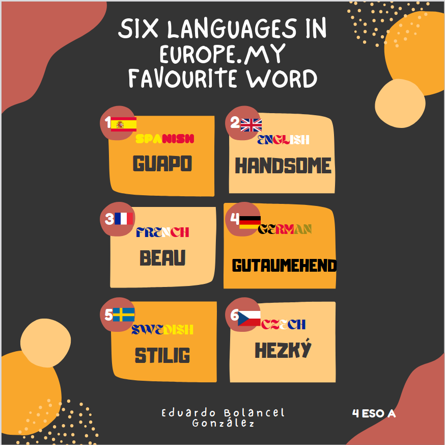 En clase de 3º A y 4º A hicimos posters con mi palabra o expresión favorita en seis diferentes idiomas. Podéis ver ejemplos en estas imágenes: