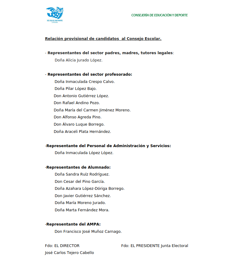 Se publica a continuación el listado provisional de candidatos y candidatas por el sector de alumnado, profesorado y madres/padres/tutores