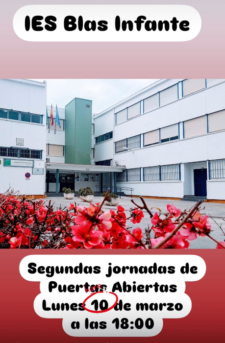 Nos complace invitarles a la Jornada de Puertas Abiertas del IES Blas Infante, que tendrá lugar el próximo 10 de marzo a las 18:00 en nuestro centro.